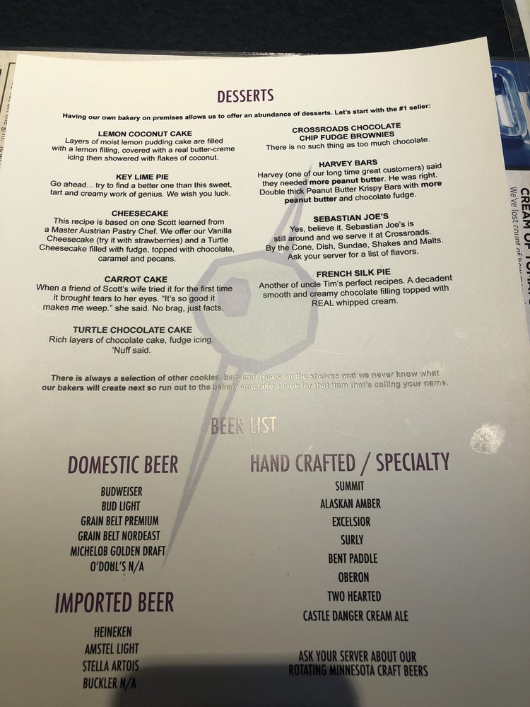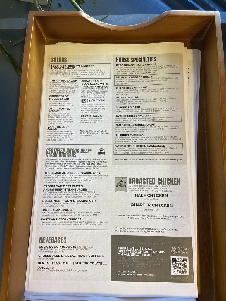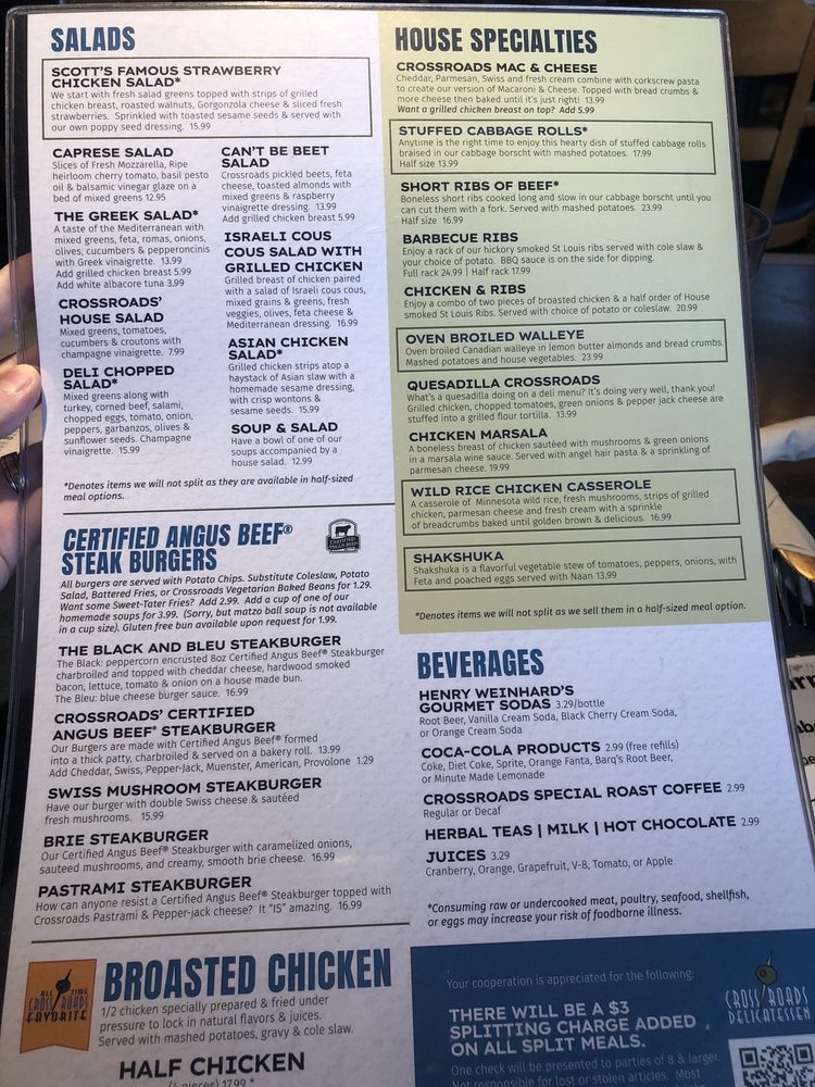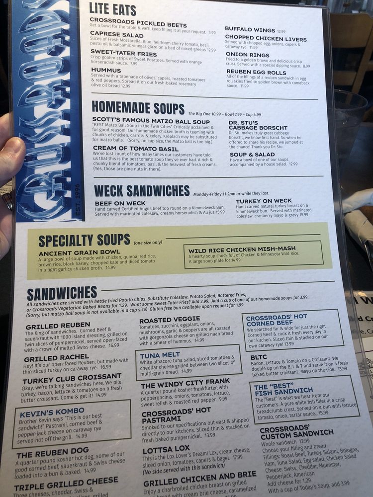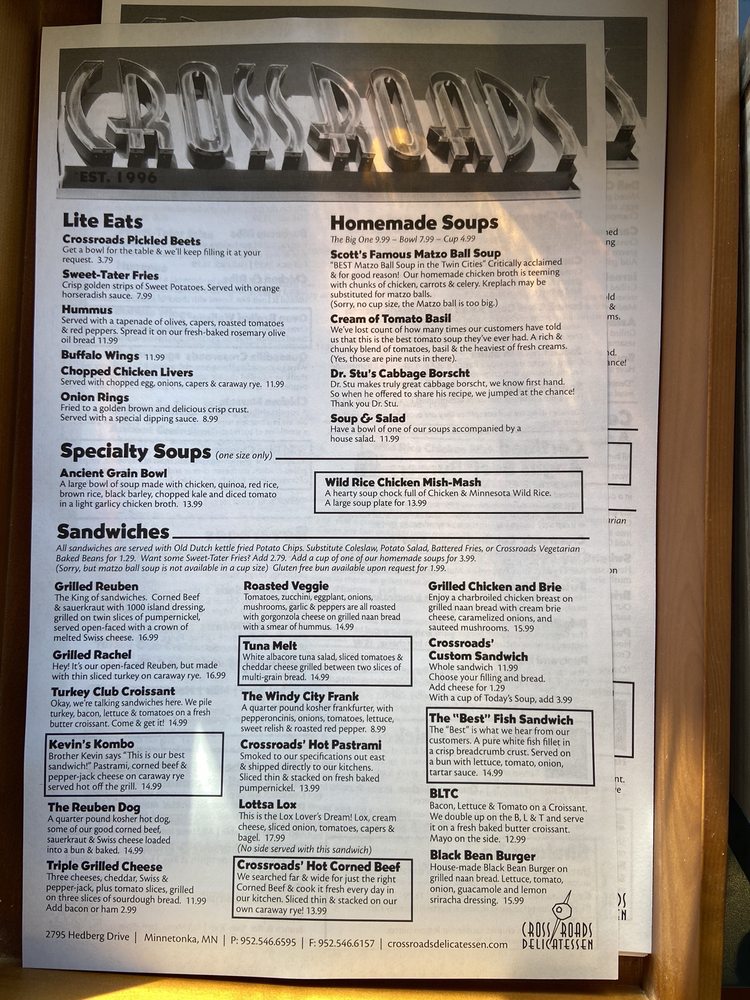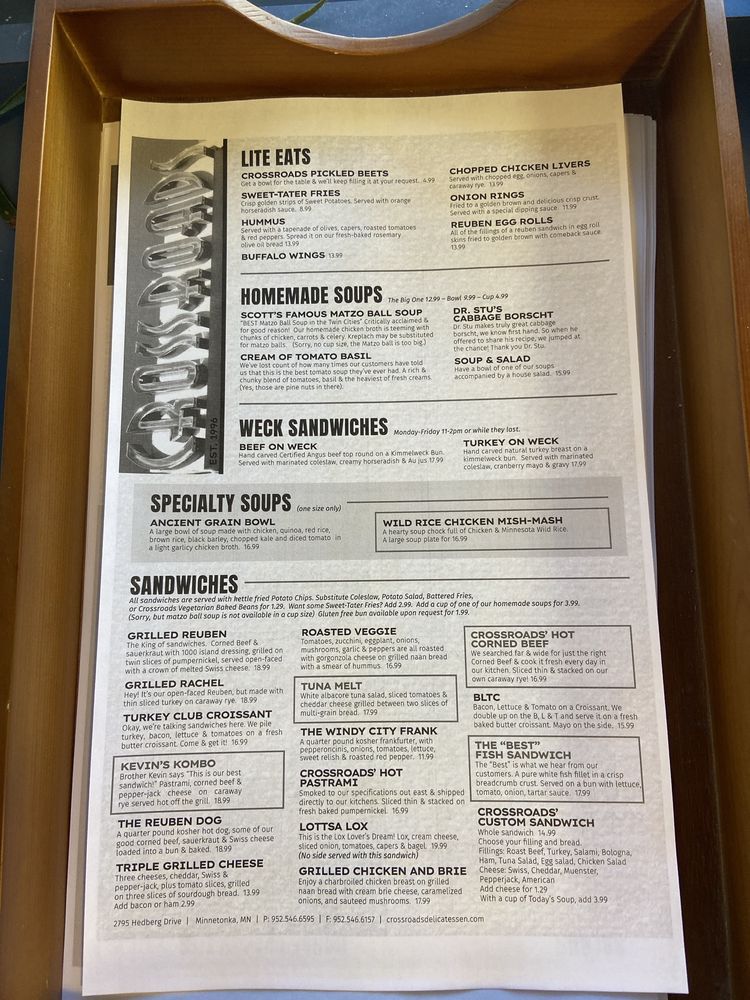 Introducing Crossroads Delicatessen, a gem located at 2795 Hedberg Dr in Minnetonka, MN. This casual spot offers a range of dishes suitable for brunch, lunch, and group gatherings. With options like the flavorful Western Omelet, decadent Butter Pecan Waffles, and comforting Matzoh Ball Soup, there's something for everyone. The menu boasts deli favorites like Corned Beef Hash and Lottsa Lox Plate, perfect for those craving a taste of tradition. Customer reviews rave about the impeccable service, inviting ambiance, and standout dishes like the unforgettable Kevin's Combo Pastrami and Corned Beef sandwich. Whether you're seeking a nostalgic dining experience or simply looking to indulge in hearty comfort food, Crossroads Delicatessen is sure to satisfy your cravings.